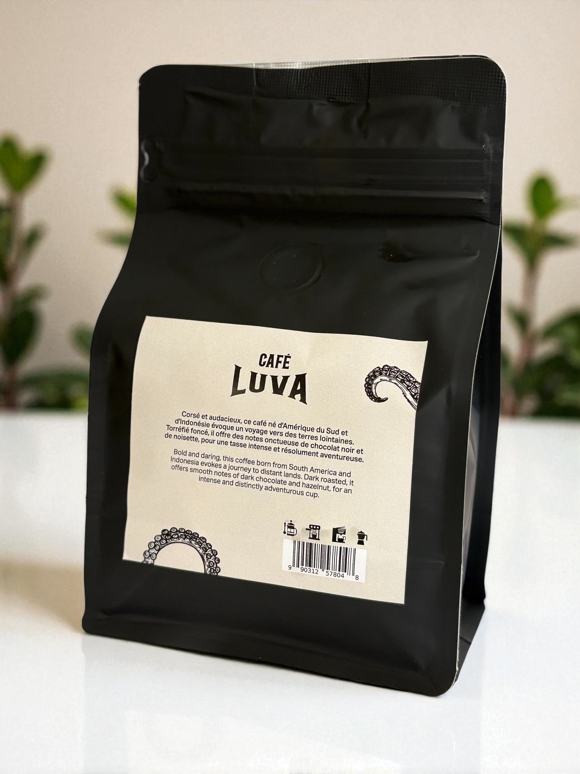 Ce café 100% arabica, torréfié foncé, révèle une richesse intense et une profondeur envoûtante. En tasse, il offre des arôme puissants de cacao, de bois grillé et de caramel brun. Sa texture veloutée et sa faible acidité en font un café corsé maîtrisé.